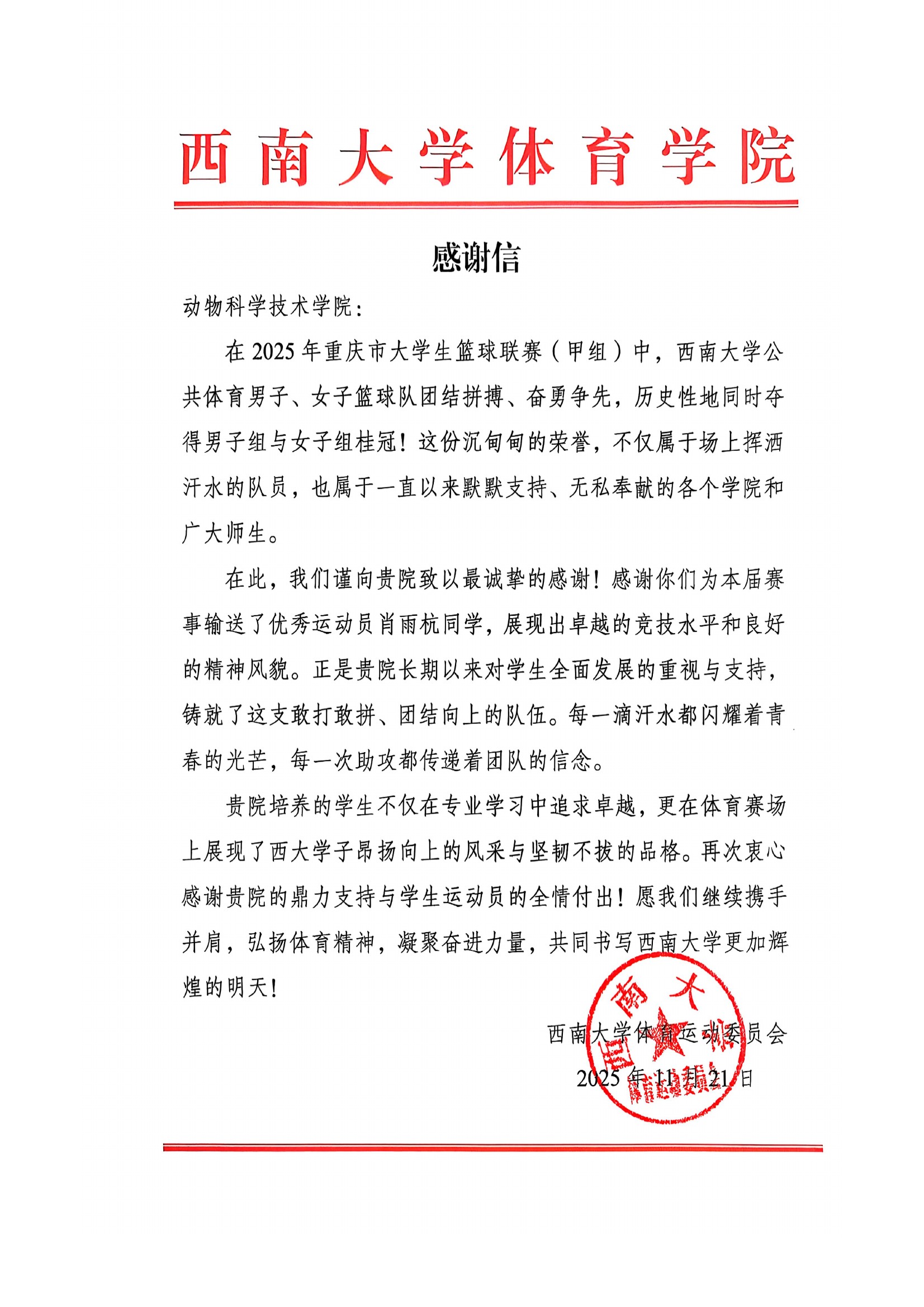 2023级动物科学专业7班本科生肖雨杭,作为学校女篮队员,以稳定发挥和顽强斗志助力女篮夺冠,其展现出的团队协作意识、抗压能力与竞技素养,赢得赛场内外一致赞誉,充分彰显了成人动漫“五育并举、全面发展”的育人成效。