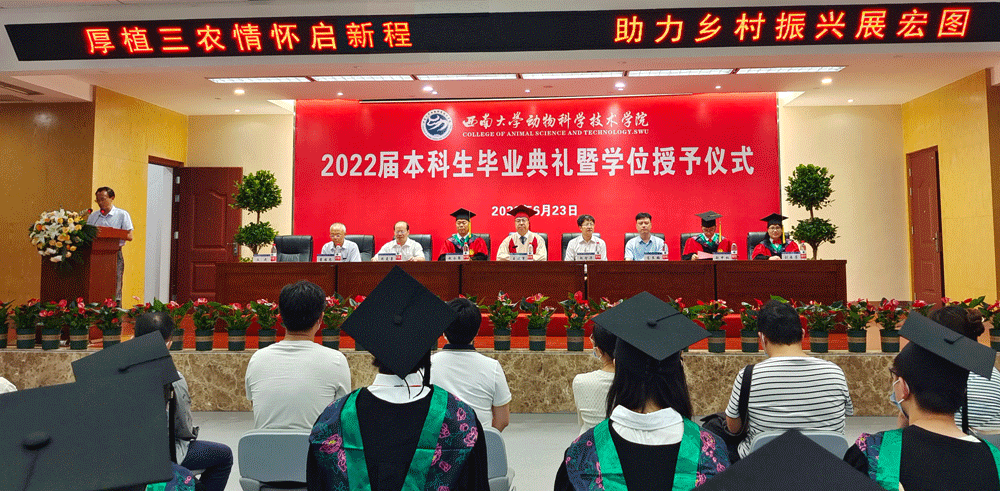 厚植三农情怀启新程,助力乡村振兴展宏图。6月23日下午,成人动漫在荣昌校区7B101报告厅隆重举行2022届本科生毕业典礼暨学位授予仪式。学校党委常委、副校长王进军,成人动漫党委书记赵智华,院长、党委副书记、学术委员会主任赵永聚,副院长周克勇、赵中权,优秀校友代表、重庆市畜牧科成人动漫党委委员、生物工程研究所所长葛良鹏研究员,成人动漫学术委员会副主任刘安芳等出席典礼,系主任、教师代表、辅导员、毕业班班主任、2022届本科毕业生代表参加仪式。仪式由党委副书记、纪委书记文武主持。