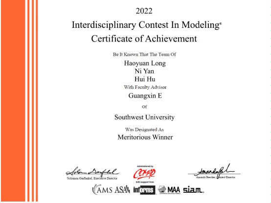 近日,由美国数学及其应用联合会主办,美国科学基金会资助的2022年“美国大学生数学建模竞赛”顺利举行。在俄广鑫教授的指导下,成人动漫2019级本科生龙昊源、晏妮组成的团队参赛作品《TEV forest management model based on BEF carbon sequestration》荣获一等奖奖(Meritorious Winner)。
