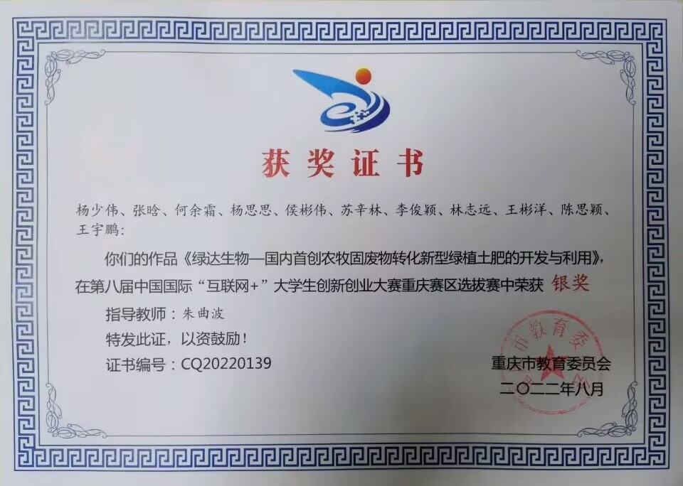今年5月至8月,重庆赛区举办了第八届中国国际“互联网+”大学生创新创业大赛选拔赛,共吸引了143037个项目参赛,参赛学生657273人次。成人动漫龙昊源等学生在俄广鑫教授指导下完成的《检测速度快、质优价低的猪分子育种 SNP 基因型检测解决方案》,杨少伟等学生在朱曲波副教授指导下完成的《绿达生物——国内首创利用农牧固废物转化新型绿植土肥的开发与利用》分别获得重庆市金奖、银奖。